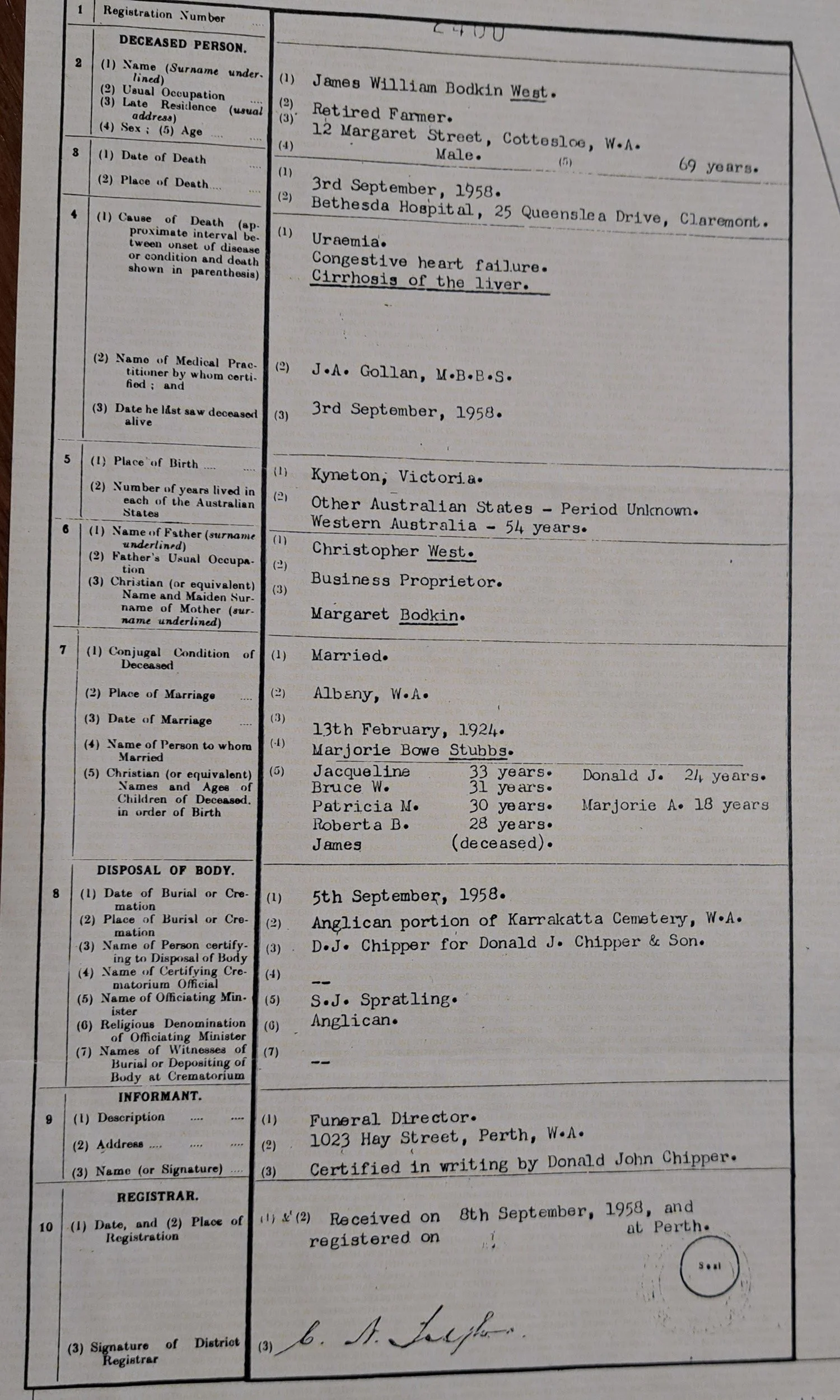 James William Bodkin West passed away on 3rd of September 1958. Marjorie lived on until 1977. Both are buried in Karrakatta cemetery.