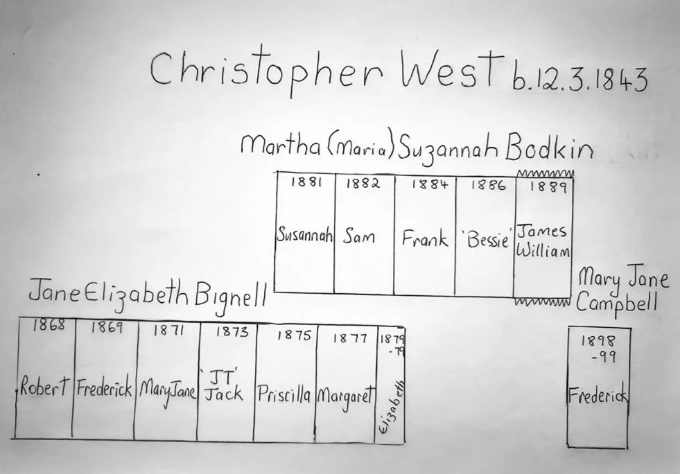 Christopher West and his first wife, Jane Bignell, had six children: Robert, Frederick, Mary Jane (m Hall), John Thomas ‘JT’, Priscilla, (m Cook), and Margaret (m Height). It is believed Jane died giving birth to twins.
