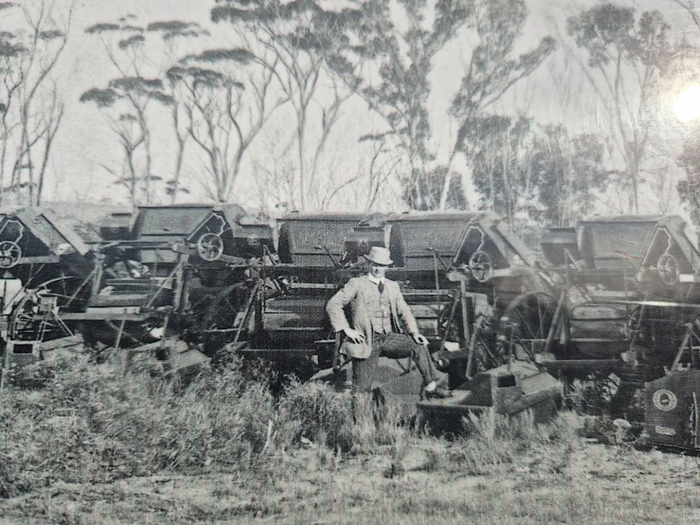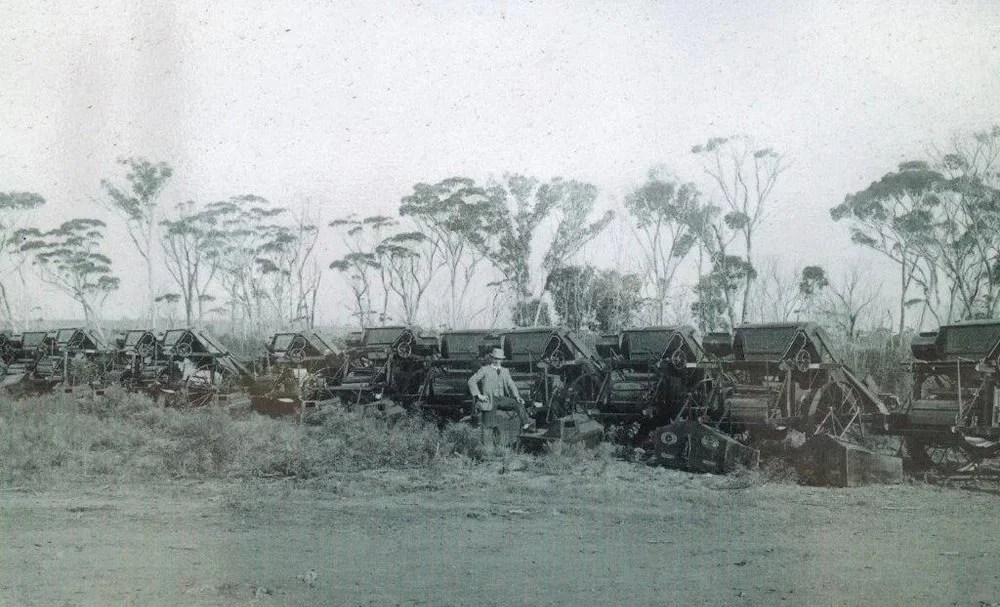 James West with the first consignment of Sunshine Harvesters in Dumbelyung. In 1912 he sold thirty, most with a comb width of six foot.