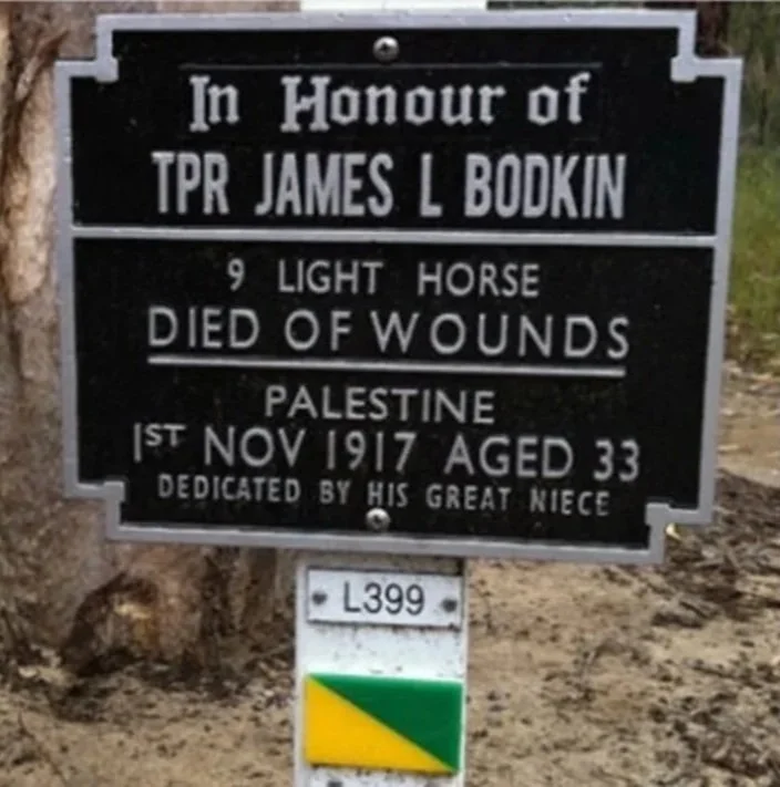Jim Lowry Bodkin’s grave is at Beersheba War Cemetery. A plaque by Jim’s great niece, Catherine on 15th February 2014, stands in the Soldiers Avenue of Honour in Kings Park, Perth.