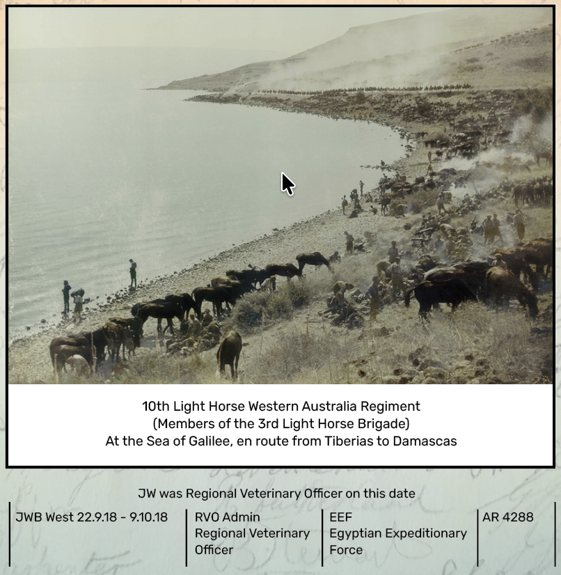 Throughout March 1918, JW was involved in diversionary raids in and around the Jordan River during the first battle of Amman before he was detached for duty with the 8th Mobile Veterinary Section (MVS).