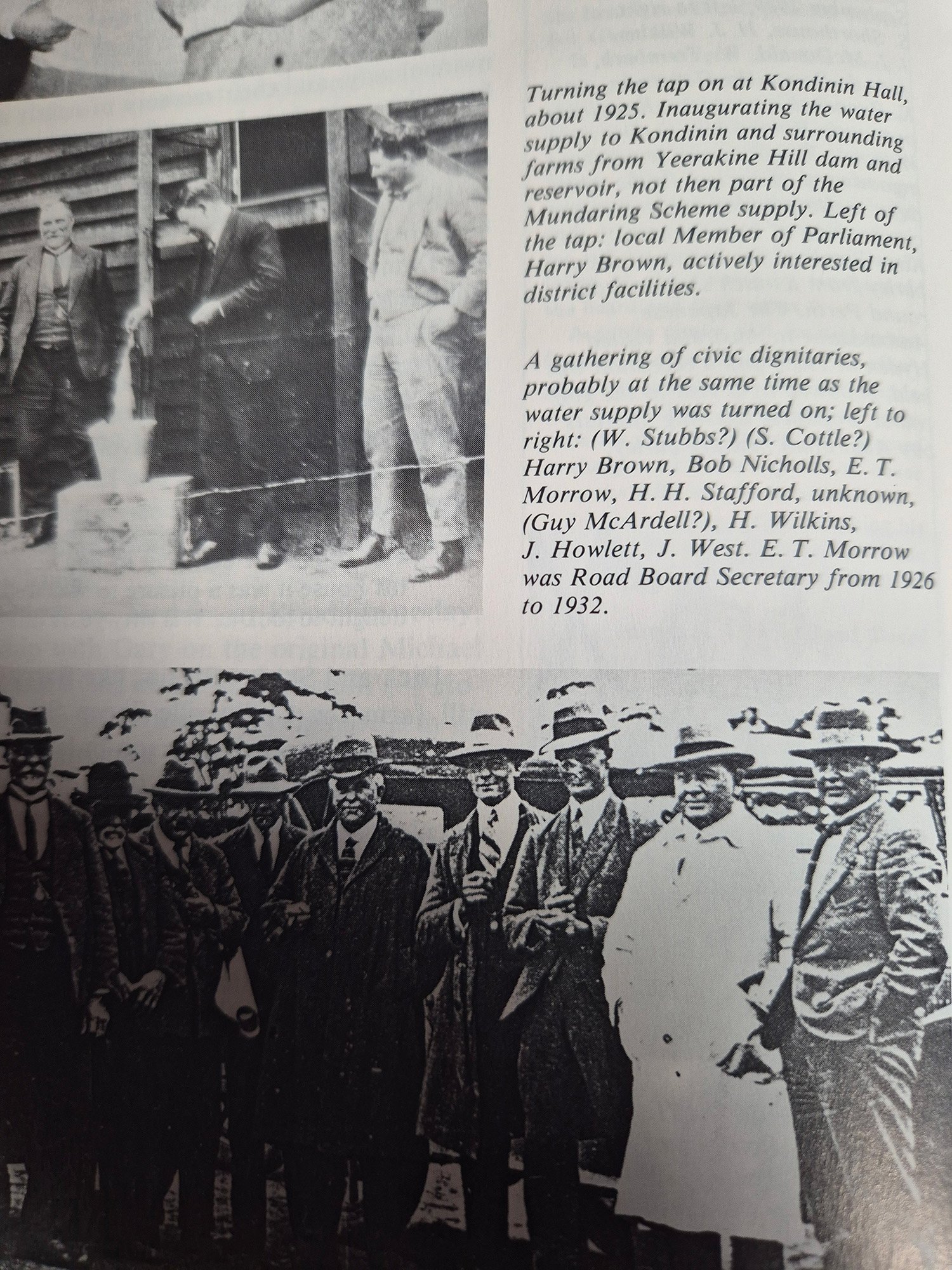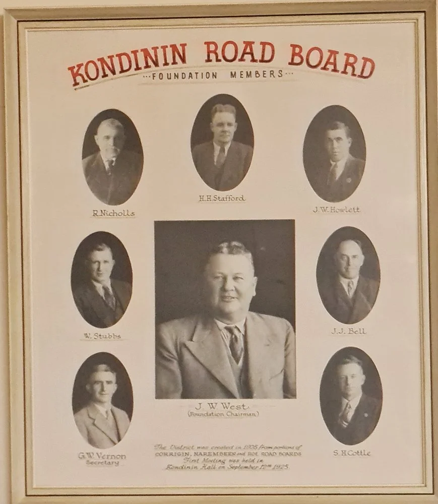Another auspicious event for 1925 was the election of James West as Chairman of the first Kondinin Roads Board. First meeting was held in Kondinin Hall on September 12th 1925. He had previously been member of the Roe Districts Board. The Kondinin population benefited immensely with JW as their comrade.