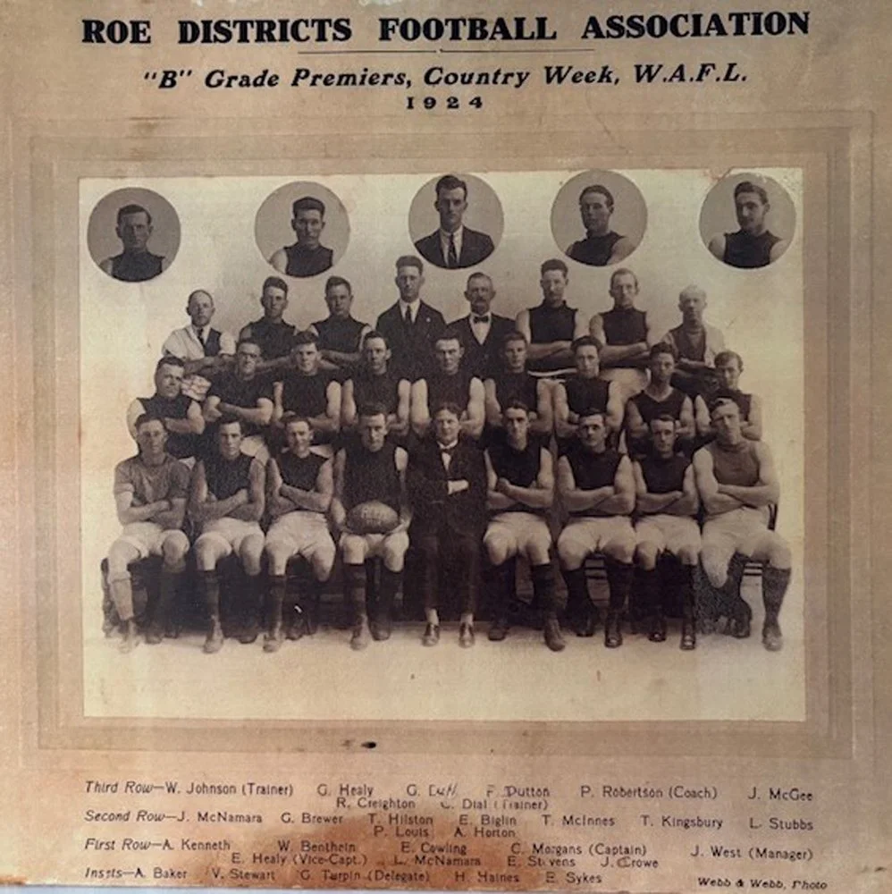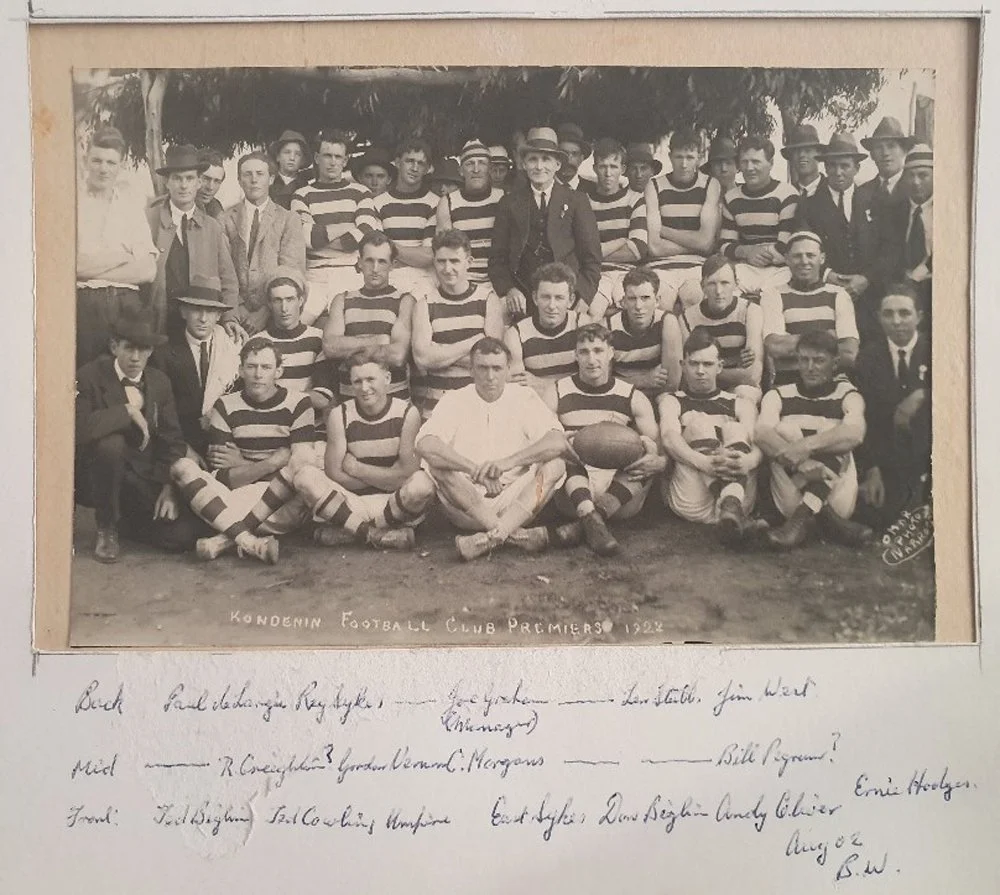JW played most sport in Kondinin and helped to get the various sports going, taking on raising money, and supporting every club in town. He was the first Secretary of the Tennis club, and he was the manager of the Kondinin Kulin (Ku-Kn) Districts Countryweek Football Team, which won premiership in 1924.