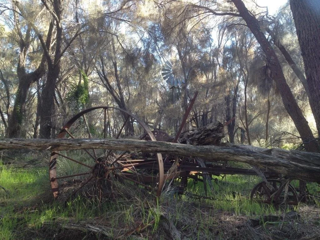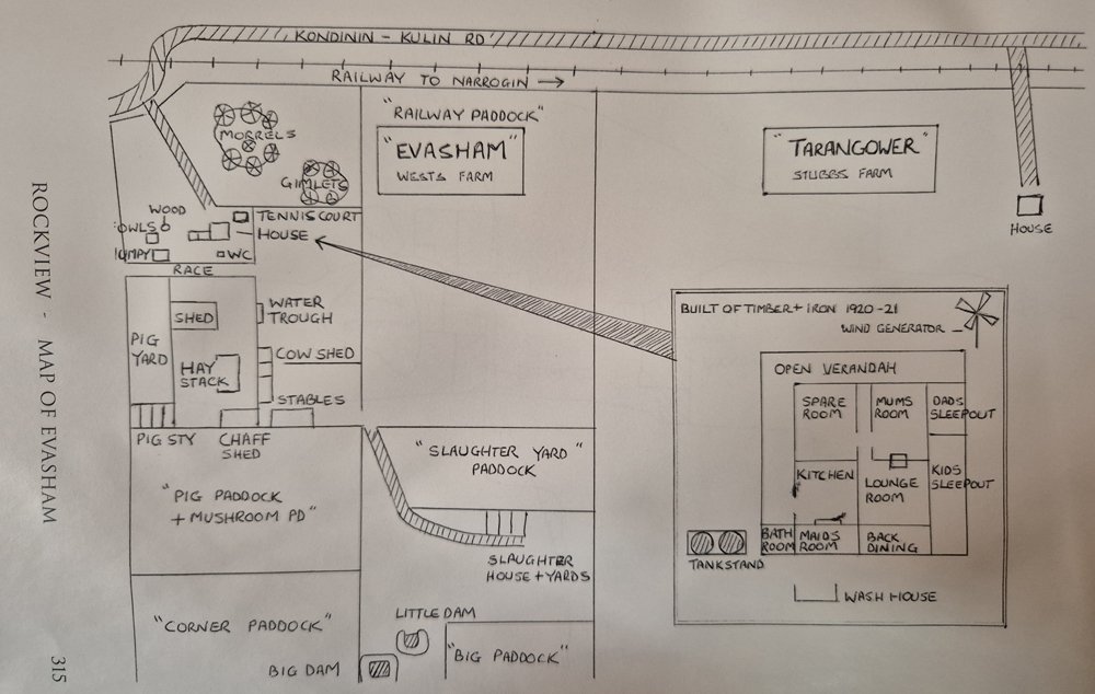 “There is a story of Rockview history that needs to be told although it is a sort of White Elephant story. It began … about 1939-40. Our Dad JW was aware a lot of water was shed off the big rock …(and)… there is a thicket of mainly wattles, jam trees and the odd York gum. This soil is very fertile. There is a Metters windmill here alongside a well almost 60 feet deep. Also, there are the remains of an old rabbit-proof fence built in 1939 to keep rabbits out of the garden. Through another 100 yards of almost impenetrable growth is the old rock dam or pool as it was known. JW had a vision of damming this abundant water from the rock to water a large fruit and vegetable garden just down the hill. He had someone chop down, burn and generally clear the acre or two and fence it with a rabbit proof fence. I first saw this venture just past this stage. The little paddock or garden had been ploughed with an old mouldboard plough and cultivated using a smallish spring tine cultivator which can still be seen close to the windmill. When I first went there with Dad there were a dozen or more young fruit trees, as well as vegies planted towards the northern end.